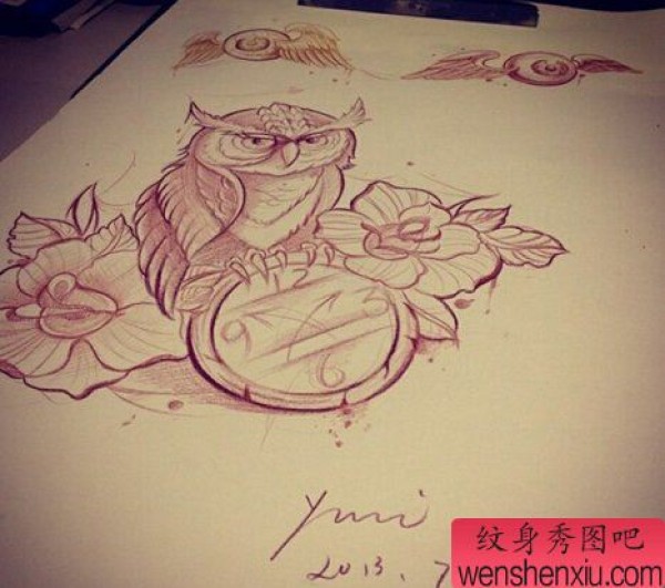 猫头鹰时钟玫瑰文身手稿作品
