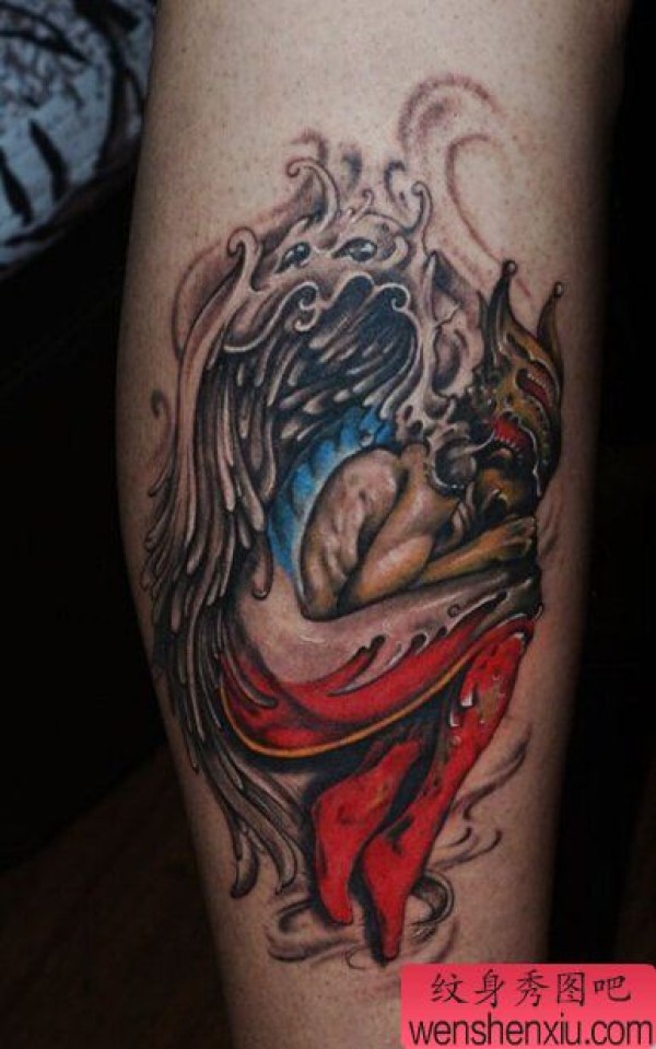 纹身图吧分享一张腿部彩色天使文身作品