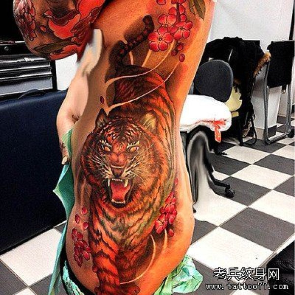纹身图吧分享一张侧腰彩色老虎文身作品