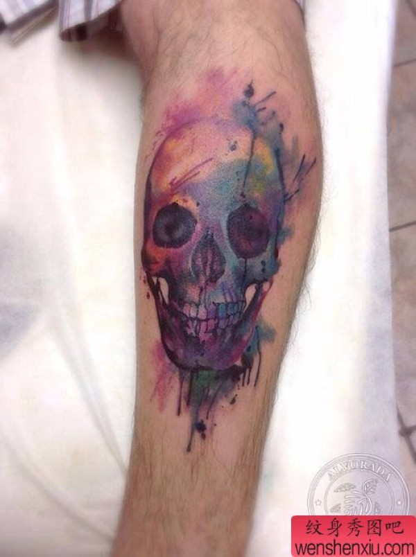 腿部彩色欧美骷髅头文身作品