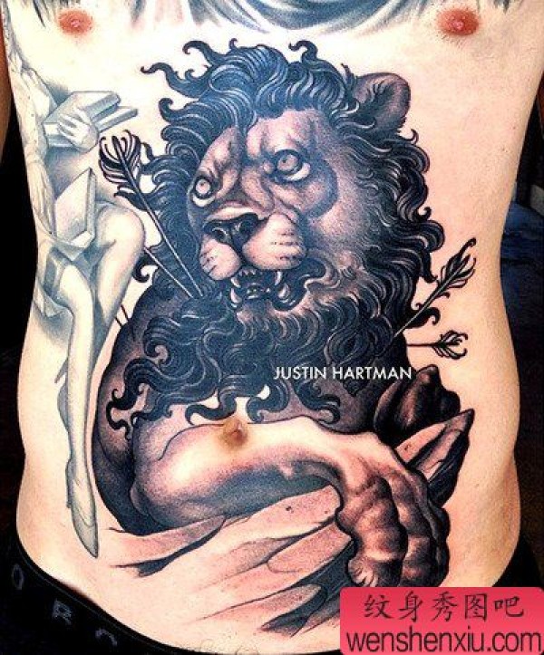 腹部黑灰狮子文身作品