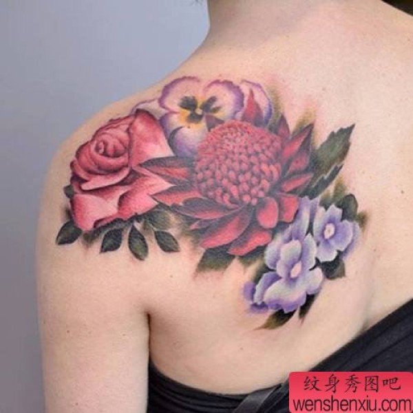 女生肩花纹身_15张女性双肩对称的肩花纹身图案作品图片