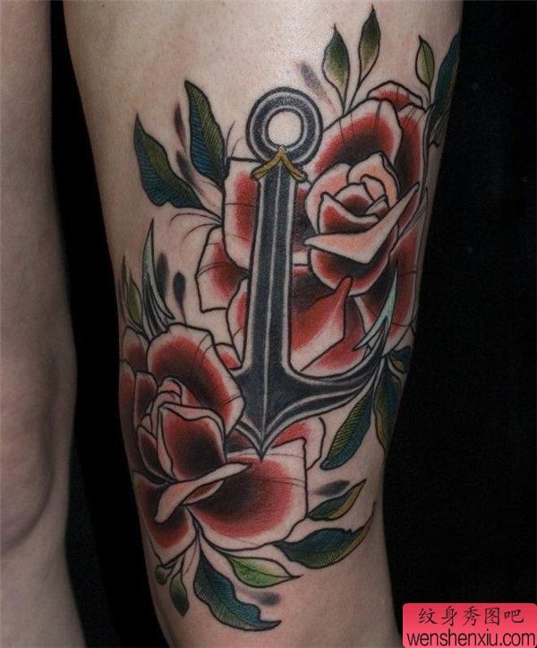 腿部船锚玫瑰文身作品