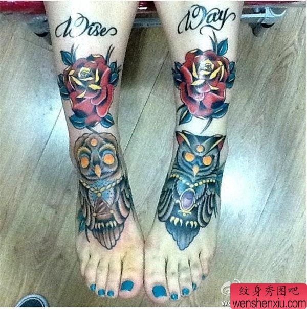 脚背彩色猫头鹰玫瑰花文身作品