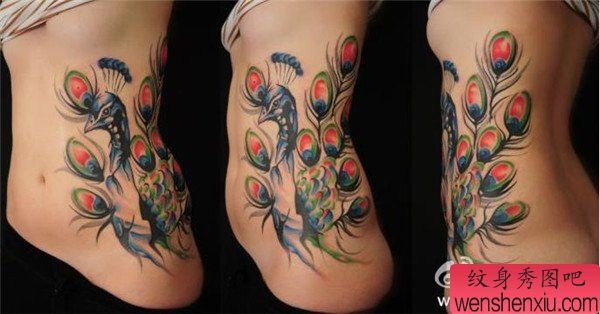 纹身图吧分享一张女性侧腰彩色孔雀文身作品