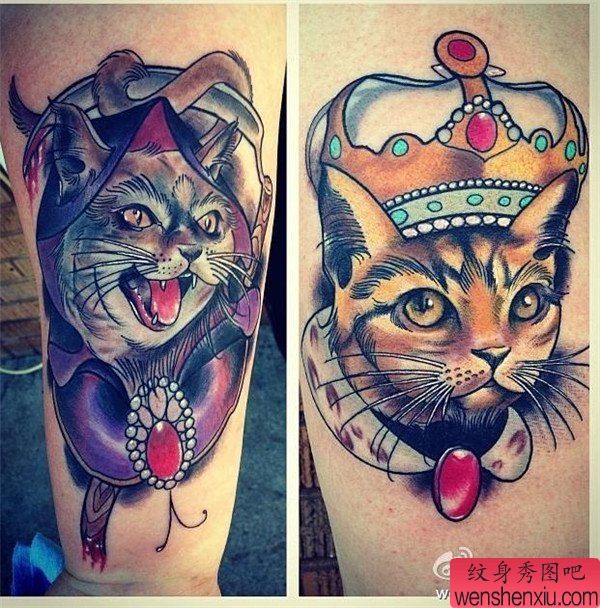 纹身图吧分享一张腿部彩色猫咪文身作品