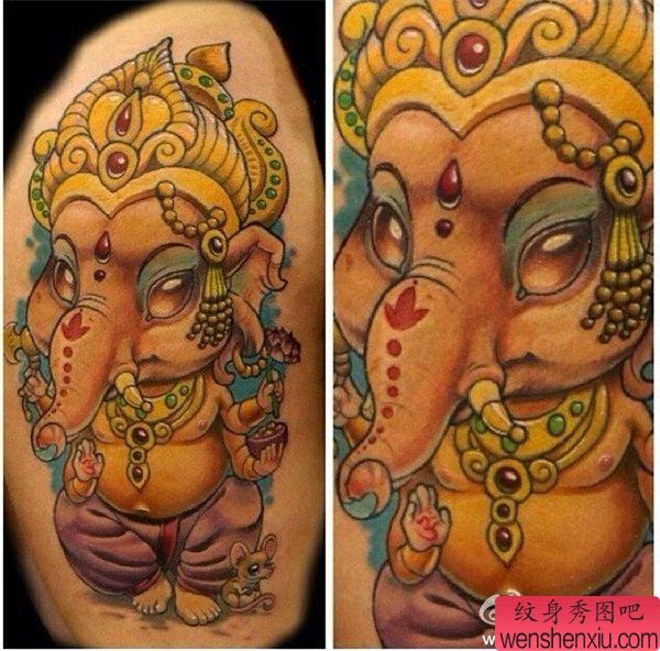 手臂彩色宗教象神文身作品