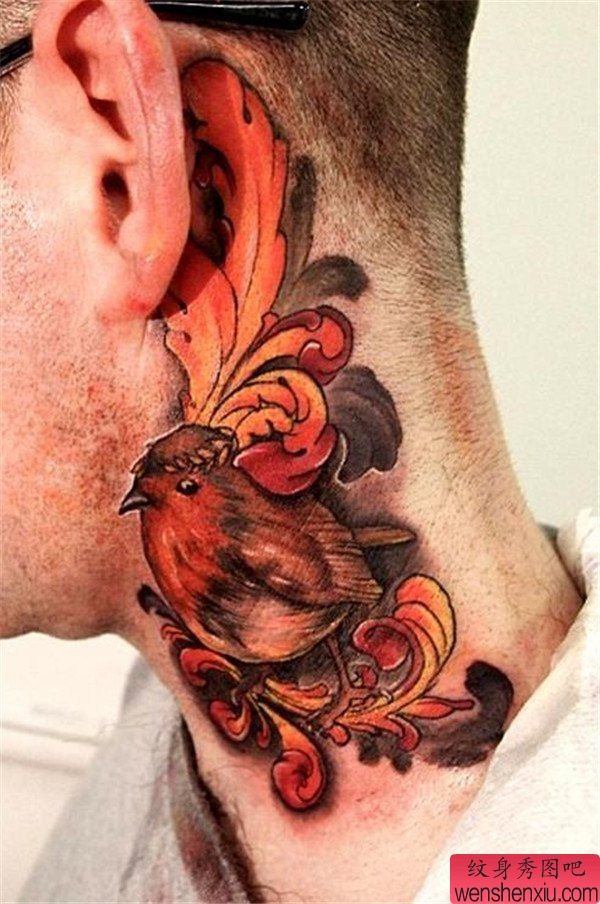 男人脖子彩色燕子刺青图案图片_脖子纹身图案大全_纹身图吧