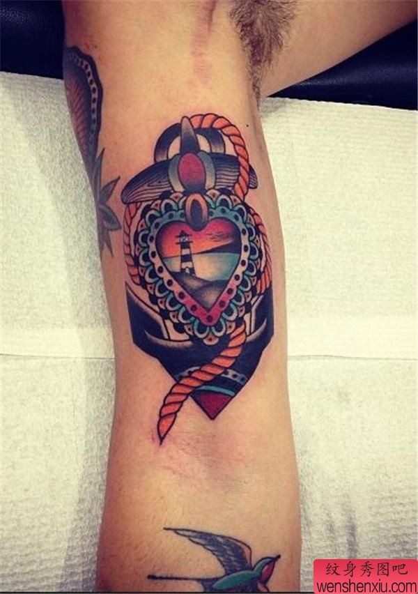 手臂彩色欧美船锚文身作品