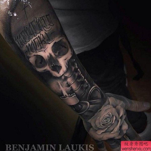 纹身图吧分享一张手臂欧美骷髅文身作品