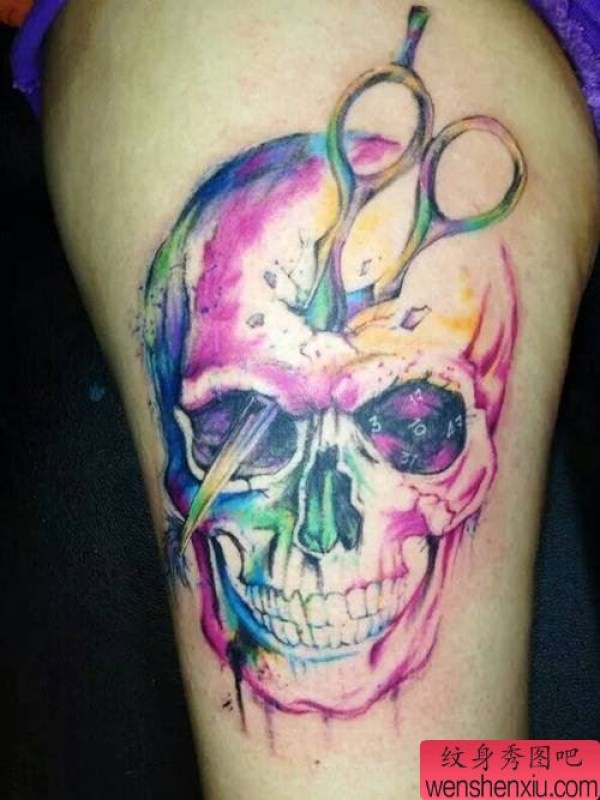 腿部彩色骷髅文身作品