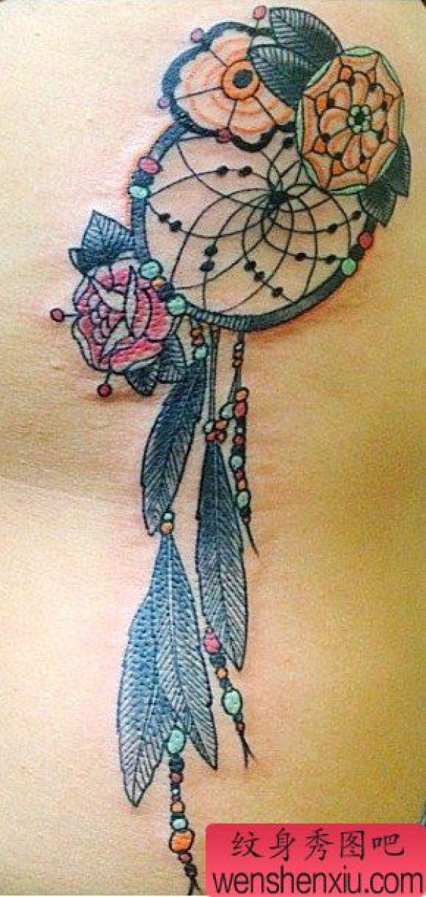 女性侧腰彩色捕梦网文身作品
