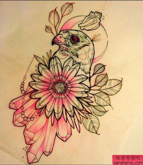 纹身图吧分享一张彩色线稿鸟花卉文身作品