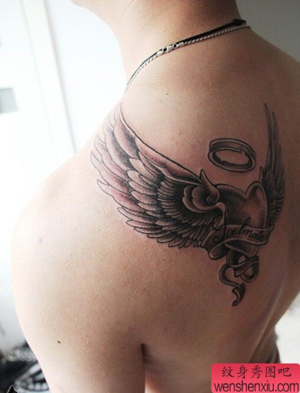 背部爱心翅膀文身作品
