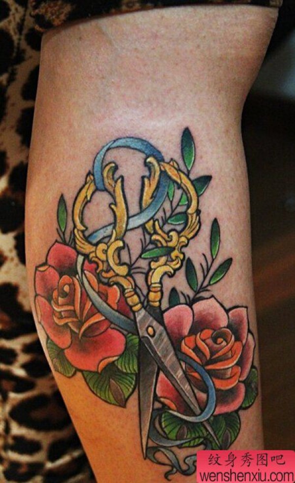 腿部School剪刀玫瑰花文身作品