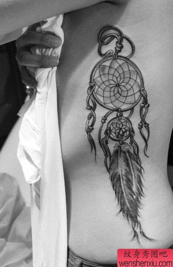 女生后腰纹身黑白灰风格抽象线条纹身图案