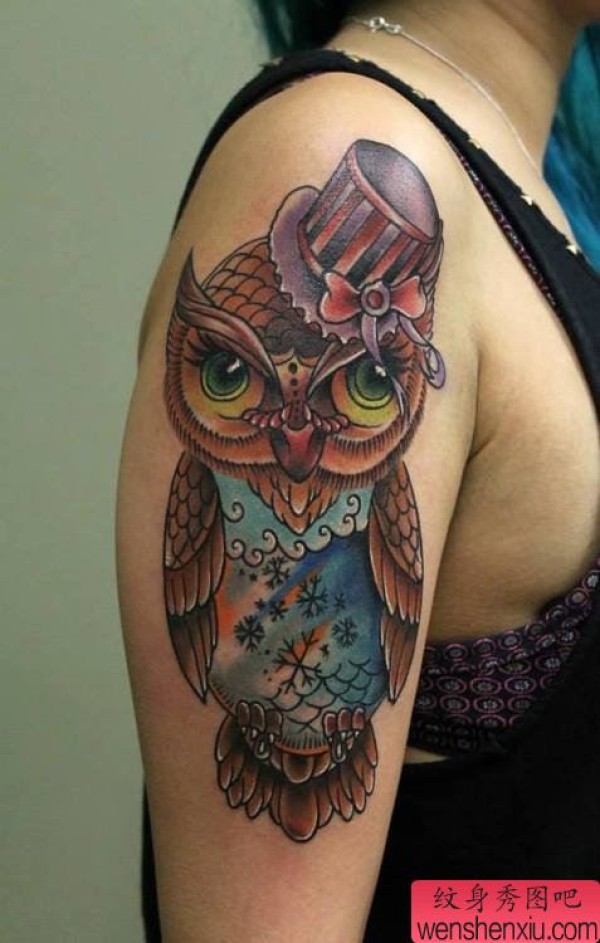 纹身图吧分享一张女性手臂彩色猫头鹰文身作品