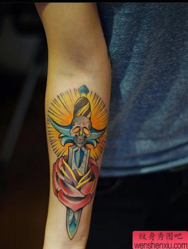 纹身图吧分享一张手臂彩色骷髅剑穿玫瑰文身作品