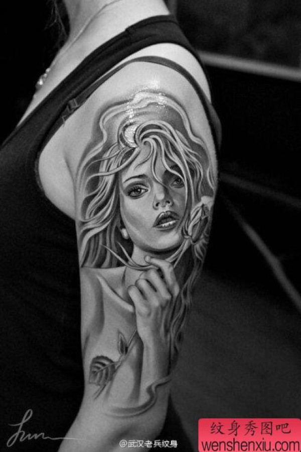 男人大臂黑白彼岸花骷髅_黑白纹身图案大全_纹身图吧