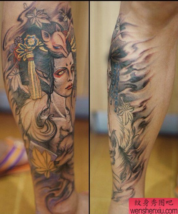 纹身图吧分享一张腿部彩色狐女文身作品