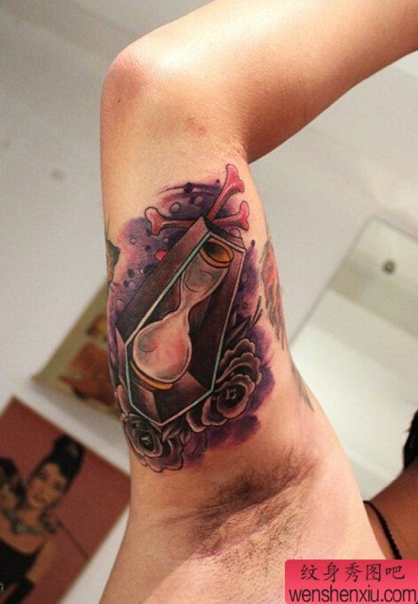 纹身图吧分享一张手臂生命沙漏玫瑰花文身作品