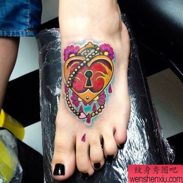 脚背彩色锁文身作品