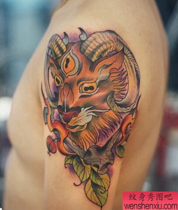 手臂彩色三眼羊文身作品由文身馆分享