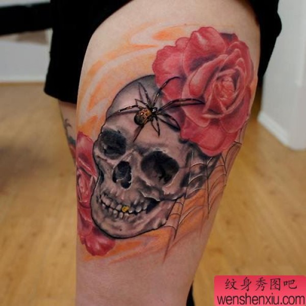 纹身图吧分享一张腿部骷髅玫瑰文身作品