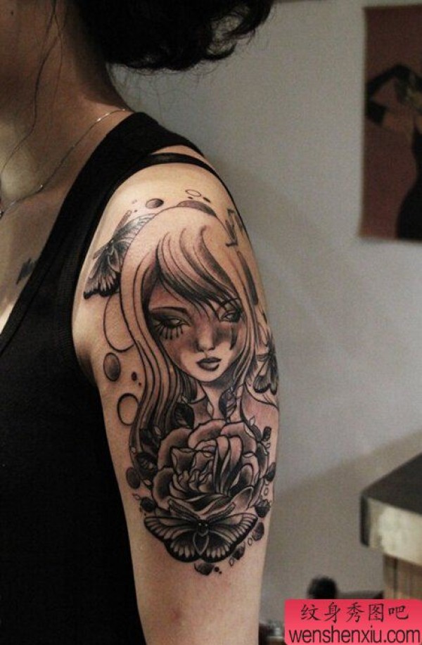 女性手臂黑白小丑蛾子文身作品由文身分享