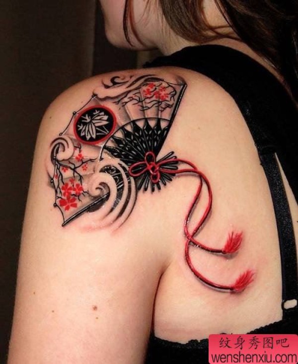 女性肩部扇子文身作品