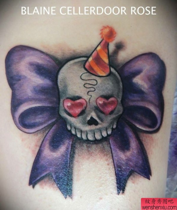 纹身图吧分享一张骷髅蝴蝶结文身作品