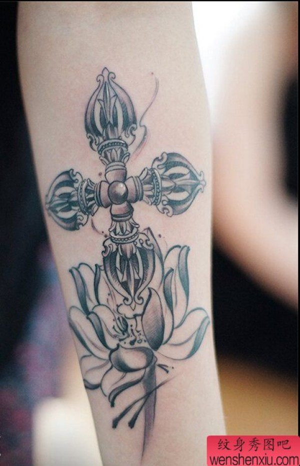 纹身图吧分享一张手臂水墨荷花与十字金刚杵文身作品