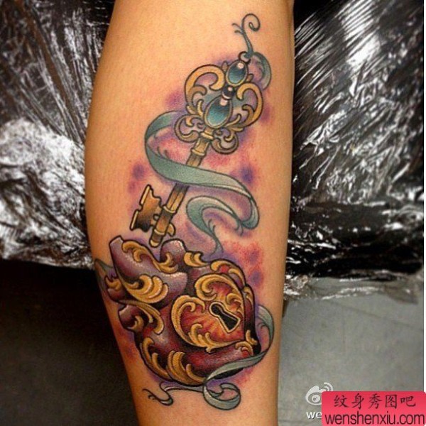 一张腿部彩色心锁文身作品