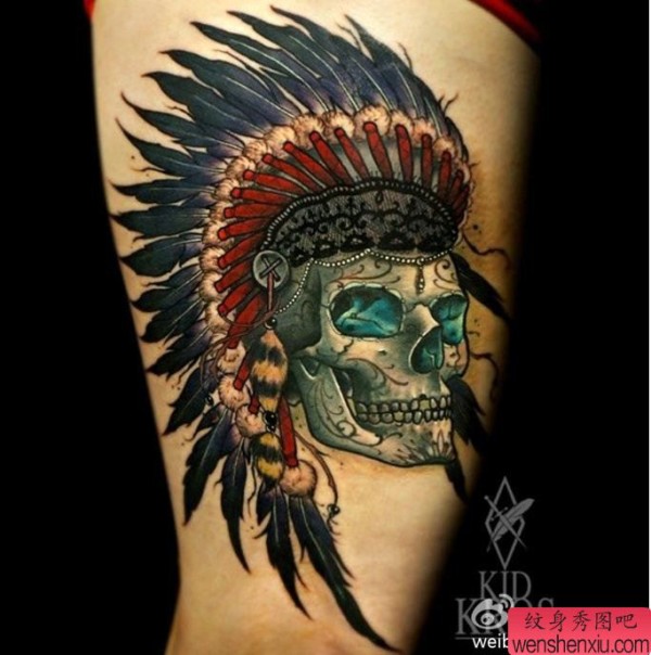 腿部印第安骷髅文身作品