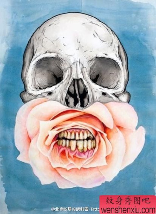 纹身图吧分享一张骷髅玫瑰文身手稿作品