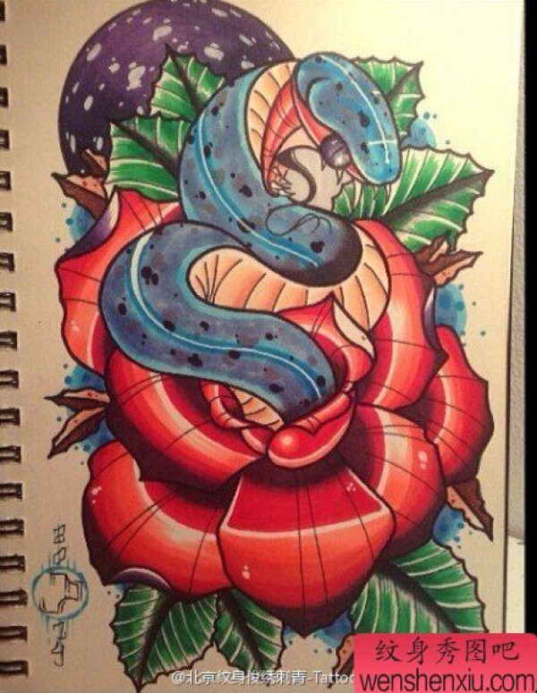 彩色欧美牡丹蛇文身作品由纹身图吧分享