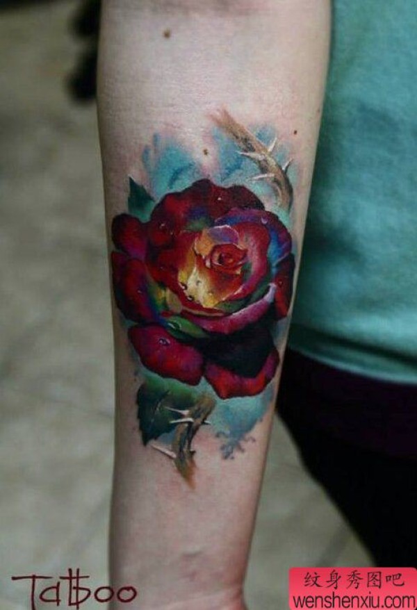 纹身图吧分享一张手臂彩色玫瑰花文身作品