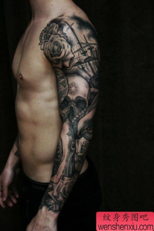 纹身图吧分享一张黑白欧美花臂文身作品