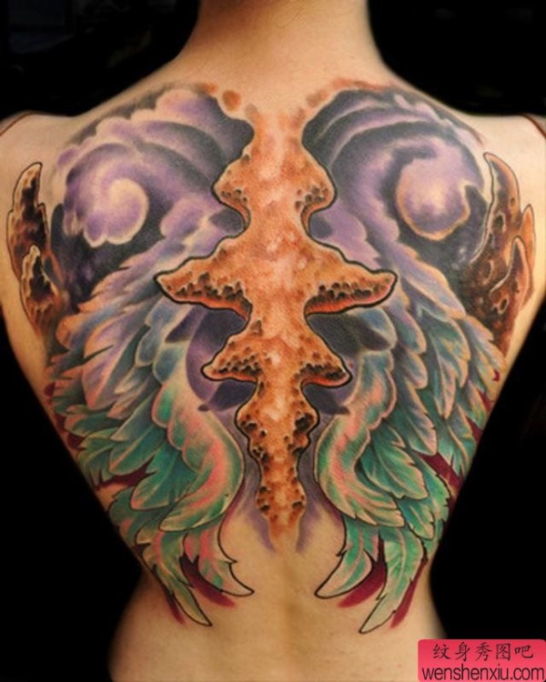 一张背部彩色翅膀文身作品由纹身图吧分享