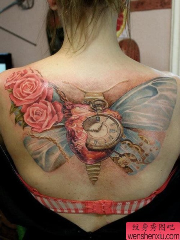 纹身图吧分享一张蝴蝶玫瑰花时钟文身作品