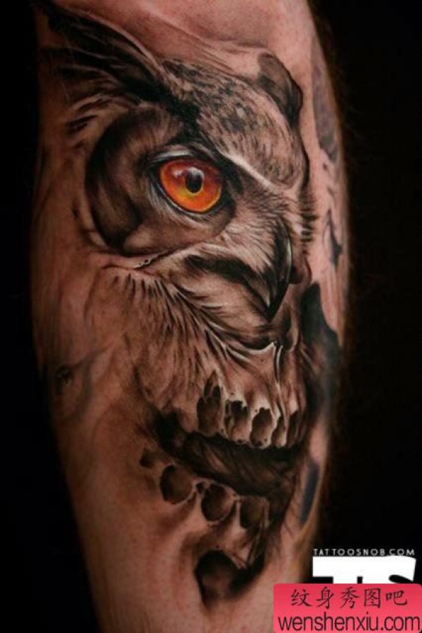 最好的文身馆分享一张腿部猫头鹰文身作品
