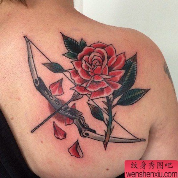纹身图吧分享一张背部射手座玫瑰花文身作品