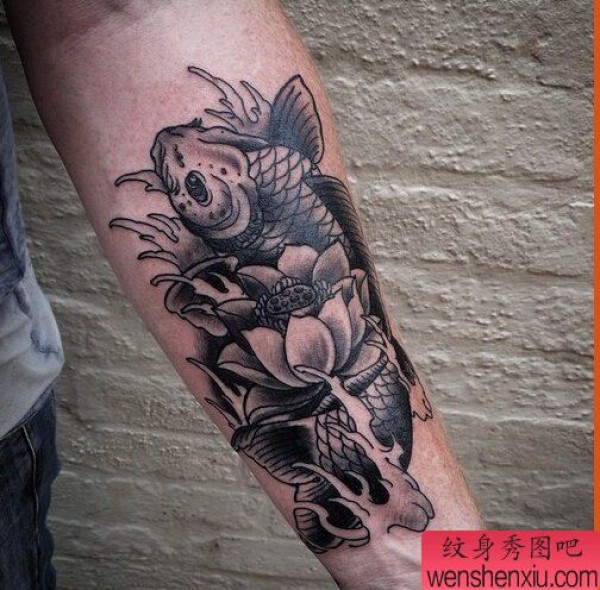 纹身图吧分享一张手臂莲花鲤鱼文身作品