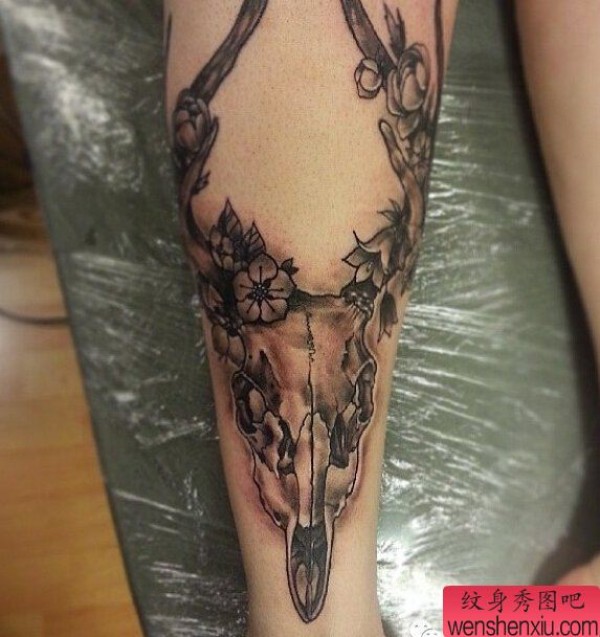 纹身图吧分享一张腿部黑白羚羊文身作品