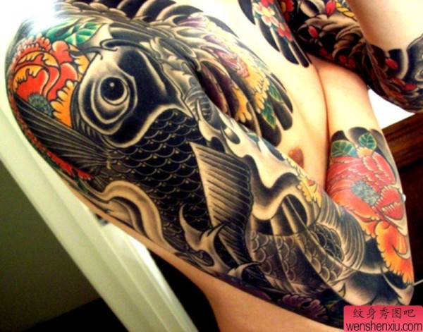 纹身图吧分享一张花臂黑白鲤鱼莲花文身