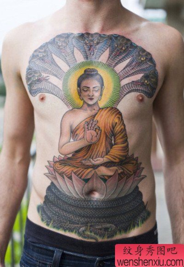 纹身图吧分享一张胸口八头蛇佛文身作品