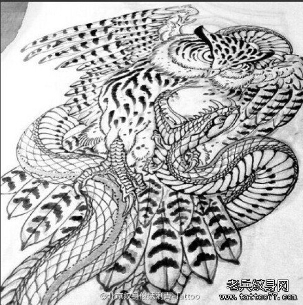 纹身图吧分享一张猫头鹰蛇文身手稿作品