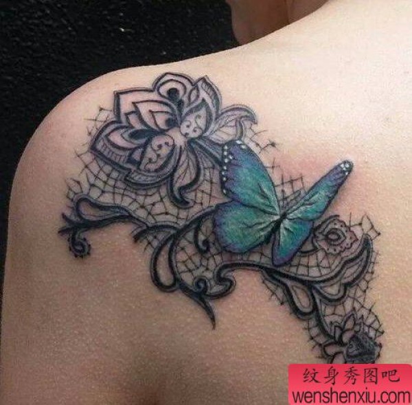 纹身图吧分享一张肩部蝴蝶玫瑰文身作品