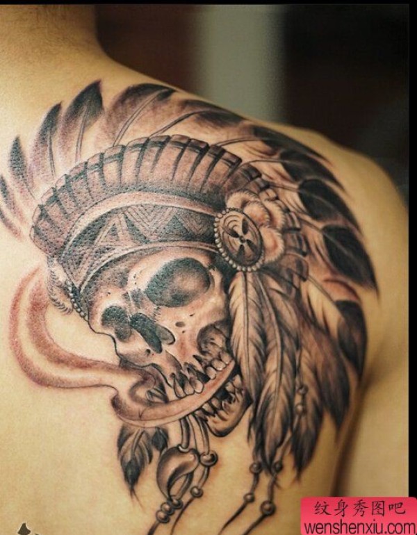 背部印第安头骨文身作品