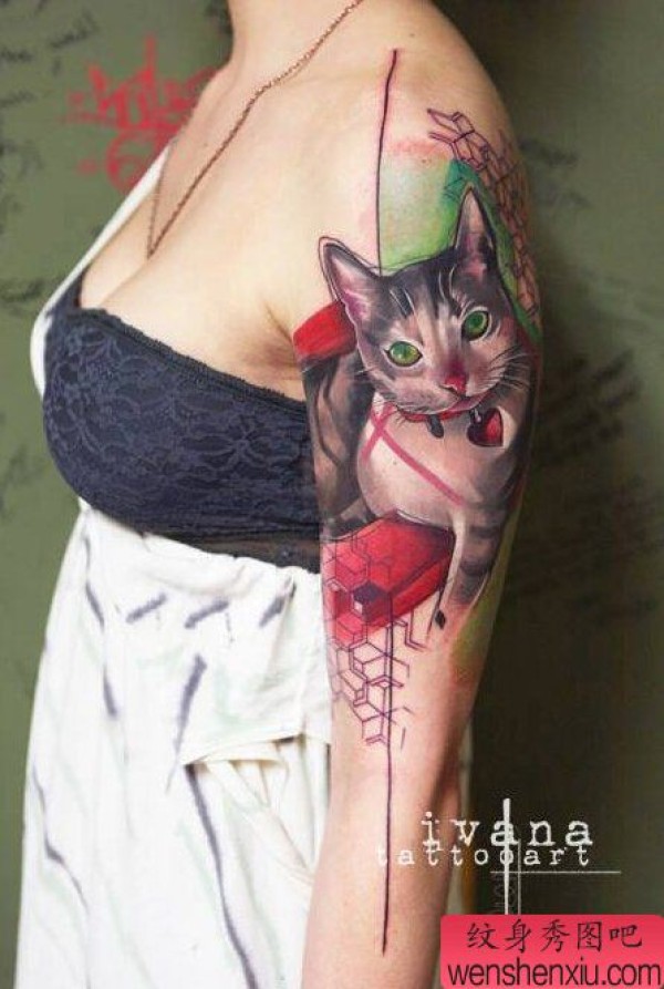 纹身图吧分享一张女性手臂彩色猫文身作品